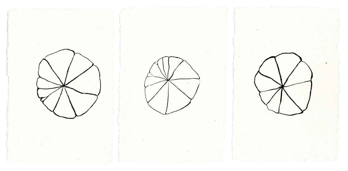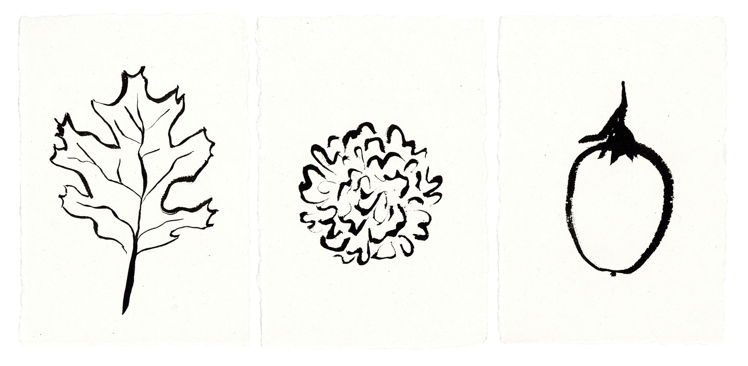 In the illustration and painting community, October is also known as #inktober and I have been keeping up with the daily challenge. This year I kept it simple and took inspiration from the garden with my own prompts. Every day I would find something that caught my eye and I’d paint with sumi on beautiful handmade watercolor paper I got from Case for Making. Throughout this newsletter, I’ve sprinkled some images I’ve painted this past month. In most cases, I made multiples trying to capture the essence and subtlety of the object. Sometimes a simple stroke can say so much and I love the minimalist exercise. I’ve decided to sell these small works; $30 for 1, $50 for 2, and if you want 3 or more they become $20 each. Please reach out via email to julie@cloutierceramics.com if you’re interested in purchasing any and I’ll reply with a pdf of what’s available.